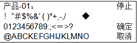 按[箭頭]鍵,將光標對準輸入文字的位置(英文數字,假名,記號),按[確認] 鍵,則可以在[品名區域]中輸入。向左移動,向右移動按[箭頭]鍵,將對準[向左移動]或[向右移動]的位置,按[確認]鍵,則[品名區域]的文字選擇位置向左或向右移動。